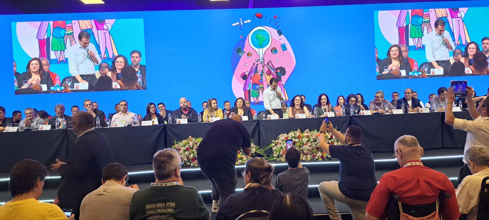 O convidado especial da primeira mesa do dia foi o professor João Cézar de Castro Rocha, que falou sobre a conjuntura diante deste momento de ataque da soberania, valorizou o sindicato e viu com otimismo a próxima eleição: “Venceremos no primeiro turno”. Para ele, precisamos parar de normalizar o absurdo. “Nós temos que estar preparados para lutar pela soberania brasileira, com determinação”.